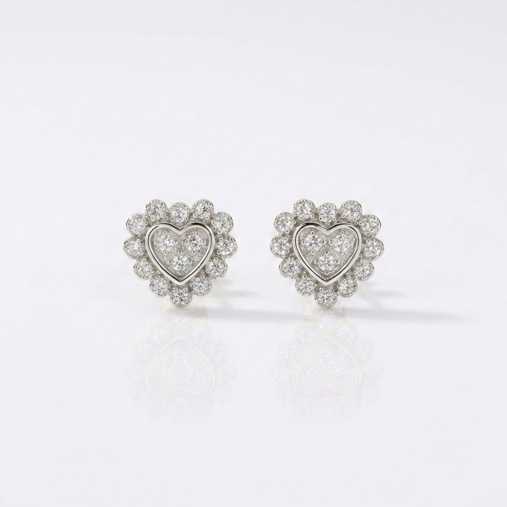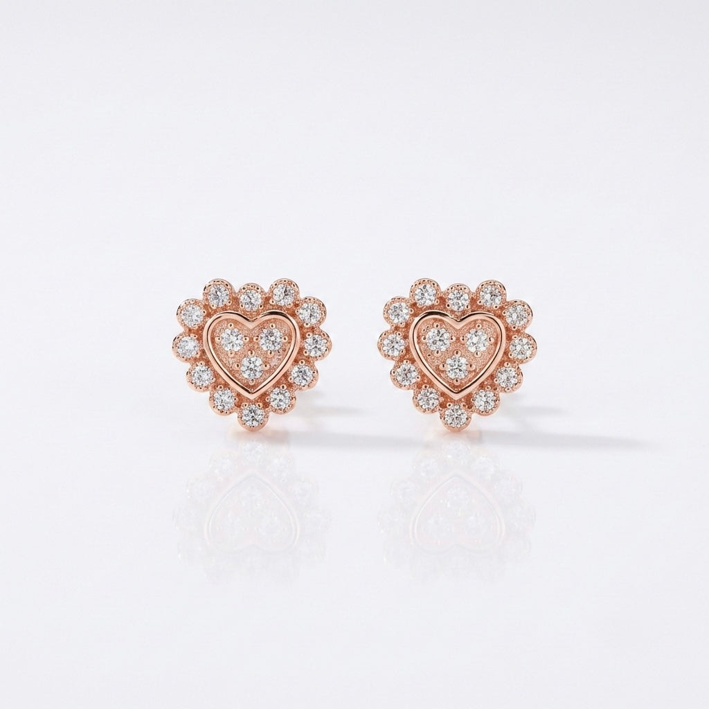 A sparkling heart-shaped stud framed with delicate pavé petals, blending sweet charm with refined elegance.